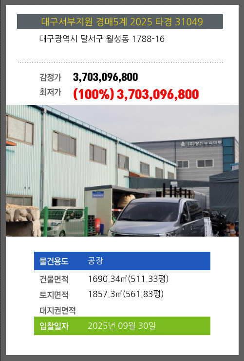 사건번호 2025 타경 31049 본건은 대구광역시 달서구 월성동 1788-16소재하는 공장경매 물건의 포스팅입니다. 건물면적 [ 1690.34㎡ (511.33평) ]토지면적 [ 1857.3㎡ (561.83평) ] 시세를 반영한 감정가 3,703,096,800에서신건으로