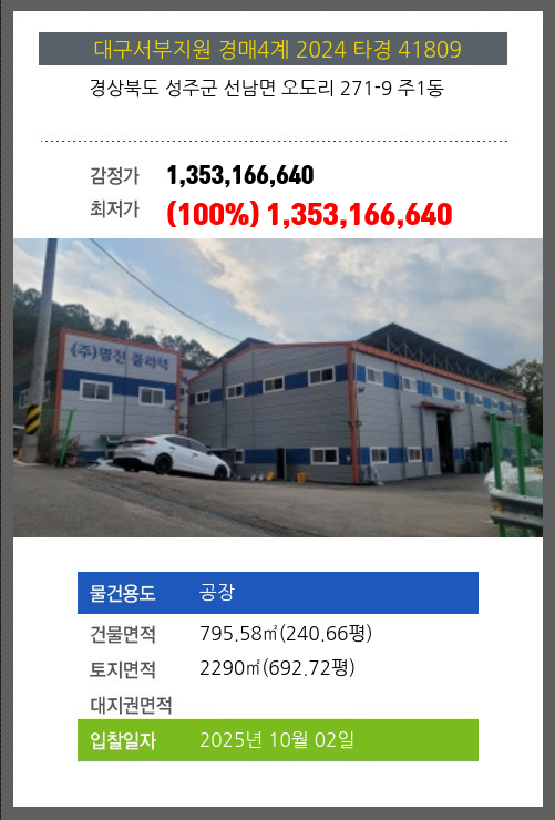 사건번호 2024 타경 41809 본건은 경상북도 성주군 선남면 오도리 271-9 주1동소재하는 공장경매 물건의 포스팅입니다. 건물면적 [ 795.58㎡ (240.66평) ]토지면적 [ 2290㎡ (692.72평) ] 시세를 반영한
