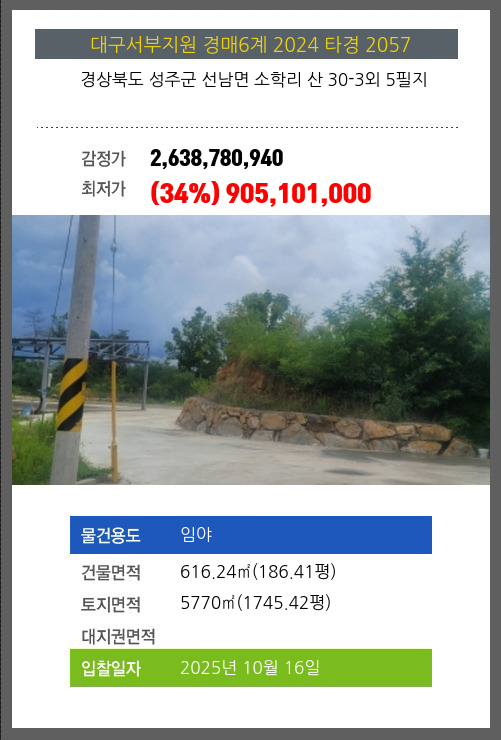 사건번호 2024 타경 2057 본건은 경상북도 성주군 선남면 소학리 산 30-3외 5필지소재하는 임야경매 물건의 포스팅입니다. 건물면적 [ 616.24㎡ (186.41평) ]토지면적 [ 5770㎡ (1745.42평) ] 시세를