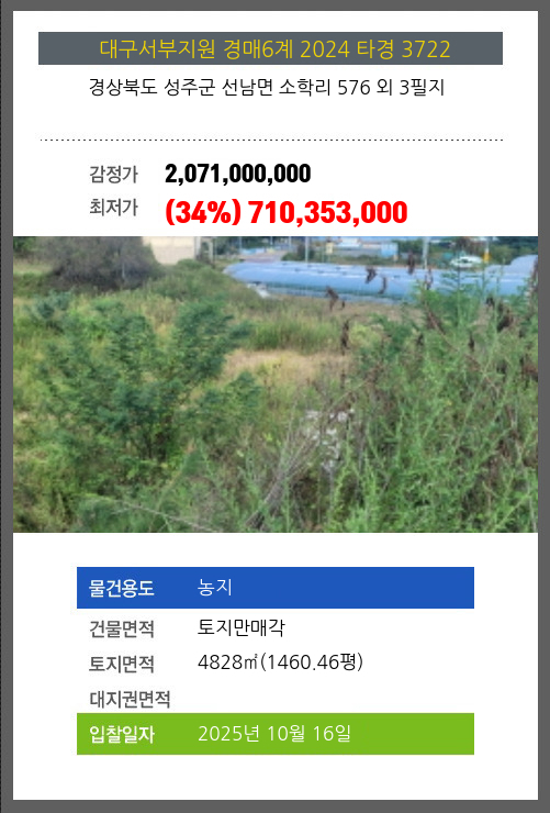 사건번호 2024 타경 3722 본건은 경상북도 성주군 선남면 소학리 576 외 3필지소재하는 농지경매 물건의 포스팅입니다. 건물면적 [ 토지만매각 ]토지면적 [ 4828㎡ (1460.46평) ] 시세를 반영한