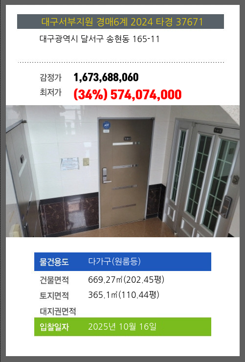 사건번호 2024 타경 37671 본건은 대구광역시 달서구 송현동 165-11소재하는 다가구(원룸등)경매 물건의 포스팅입니다. 건물면적 [ 669.27㎡ (202.45평) ]토지면적 [ 365.1㎡ (110.44평) ] 시세를 반영한 감정가 1,673,688,060에서3회
