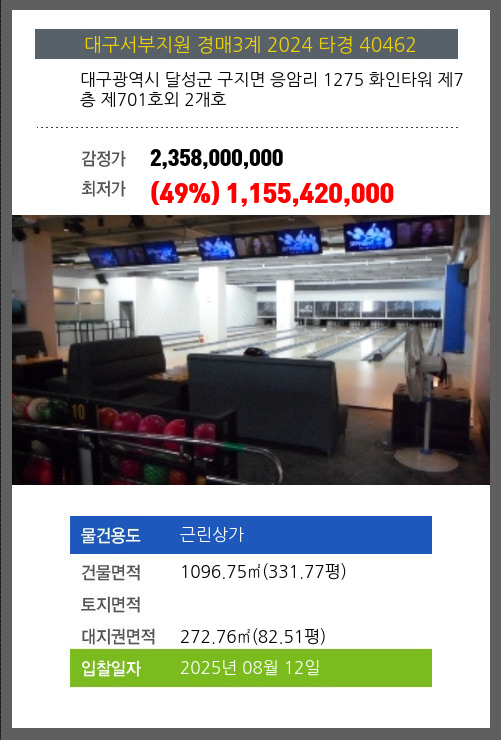 사건번호 2024 타경 40462 본건은 대구광역시 달성군 구지면 응암리 1275 화인타워 제7층 제701호외 2개호소재하는 근린상가경매 물건의 포스팅입니다. 건물면적 [ 1096.75㎡ (331.77평) ]대지권 [ 272.76㎡ (82.51평)