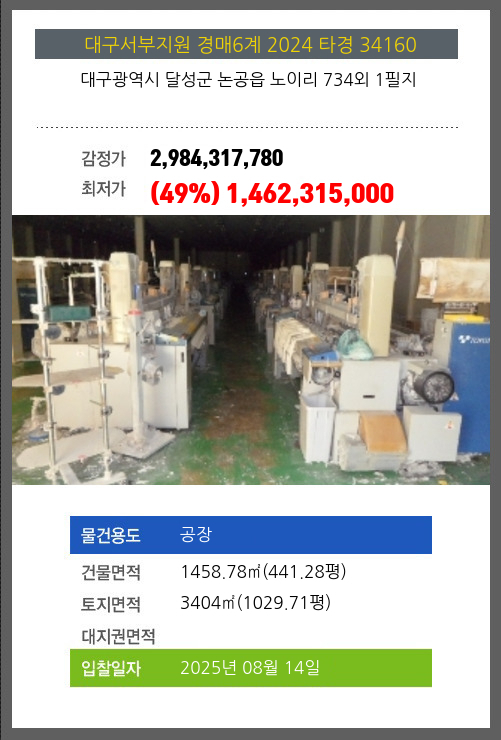 사건번호 2024 타경 34160 본건은 대구광역시 달성군 논공읍 노이리 734외 1필지소재하는 공장경매 물건의 포스팅입니다. 건물면적 [ 1458.78㎡ (441.28평) ]토지면적 [ 3404㎡ (1029.71평) ] 시세를 반영한