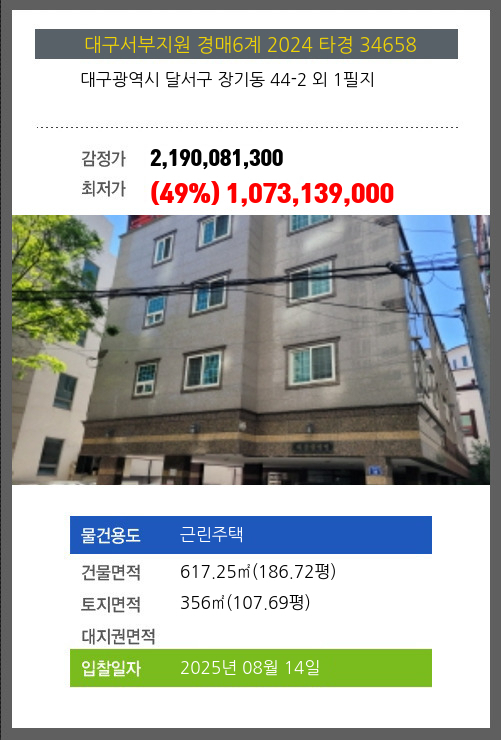 사건번호 2024 타경 34658 본건은 대구광역시 달서구 장기동 44-2 외 1필지소재하는 근린주택경매 물건의 포스팅입니다. 건물면적 [ 617.25㎡ (186.72평) ]토지면적 [ 356㎡ (107.69평) ] 시세를 반영한