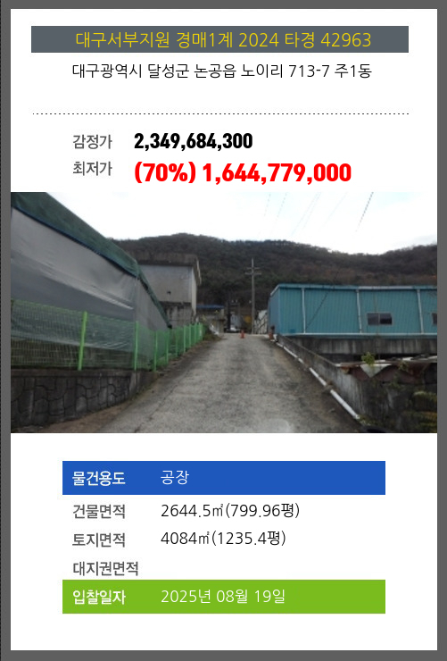 사건번호 2024 타경 42963 본건은 대구광역시 달성군 논공읍 노이리 713-7 주1동소재하는 공장경매 물건의 포스팅입니다. 건물면적 [ 2644.5㎡ (799.96평) ]토지면적 [ 4084㎡ (1235.4평) ] 시세를 반영한