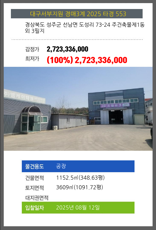 사건번호 2025 타경 553 본건은 경상북도 성주군 선남면 도성리 73-24 주건축물제1동외 3필지소재하는 공장경매 물건의 포스팅입니다. 건물면적 [ 1152.5㎡ (348.63평) ]토지면적 [ 3609㎡ (1091.72평) ] 시세를