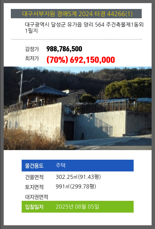 사건번호 2024 타경 44266(1) 본건은 대구광역시 달성군 유가읍 양리 564 주건축물제1동외 1필지소재하는 주택경매 물건의 포스팅입니다. 건물면적 [ 302.25㎡ (91.43평) ]토지면적 [ 991㎡ (299.78평) ] 시세를