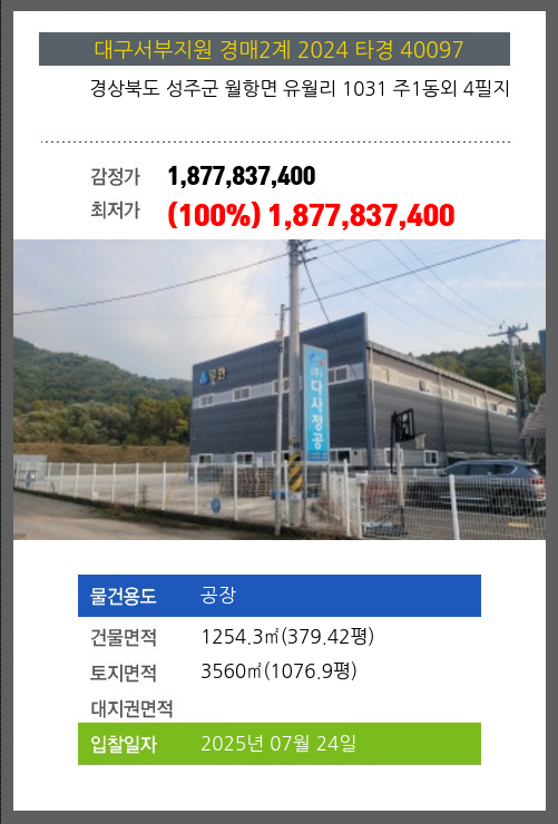 사건번호 2025 타경 30977 본건은 경상북도 성주군 선남면 선원리 460 주1동외 9필지소재하는 공장경매 물건의 포스팅입니다. 건물면적 [ 1388.77㎡ (420.1평) ]토지면적 [ 전체:3658㎡ (1106.54평) 매각지분:3577㎡ (1082.04평)