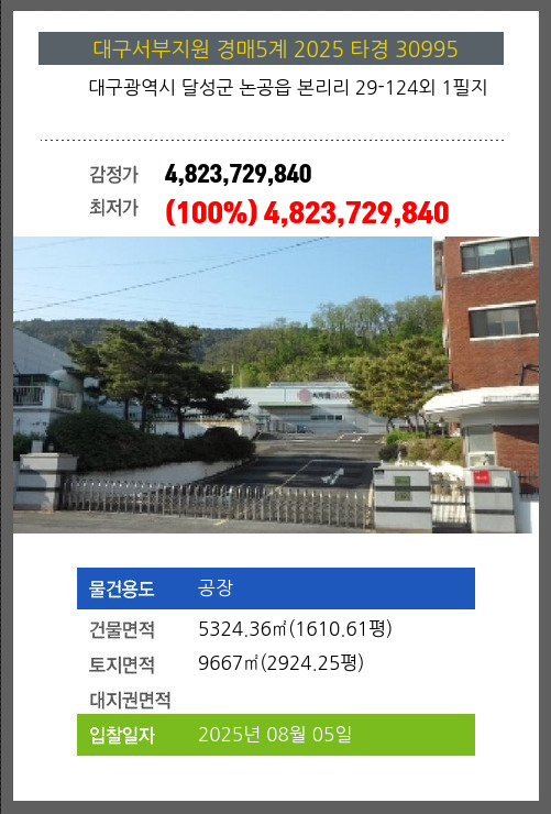 사건번호 2025 타경 30995 본건은 대구광역시 달성군 논공읍 본리리 29-124외 1필지소재하는 공장경매 물건의 포스팅입니다. 건물면적 [ 5324.36㎡ (1610.61평) ]토지면적 [ 9667㎡ (2924.25평) ] 시세를 반영한