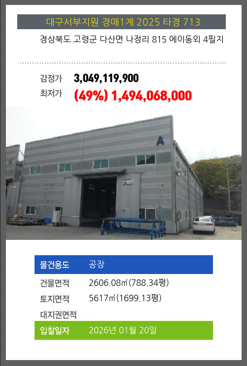 사건번호 2025 타경 713 본건은 경상북도 고령군 다산면 나정리 815 에이동외 4필지소재하는 공장경매 물건의 포스팅입니다. 건물면적 [ 2606.08㎡ (788.34평) ]토지면적 [ 5617㎡ (1699.13평) ] 시세를