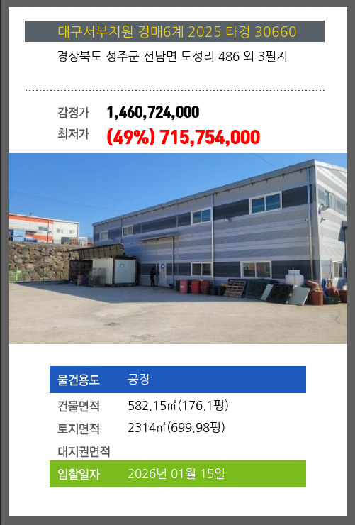 사건번호 2025 타경 30660 본건은 경상북도 성주군 선남면 도성리 486 외 3필지소재하는 공장경매 물건의 포스팅입니다. 건물면적 [ 582.15㎡ (176.1평) ]토지면적 [ 2314㎡ (699.98평) ] 시세를