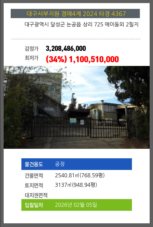 사건번호 2024 타경 4367 본건은 대구광역시 달성군 논공읍 상리 725 에이동외 2필지소재하는 공장경매 물건의 포스팅입니다. 건물면적 [ 2540.81㎡ (768.59평) ]토지면적 [ 3137㎡ (948.94평) ] 시세를