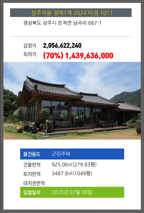 사건번호 2024 타경 1011 본건은 경상북도 상주시 은척면 남곡리 667-1소재하는 근린주택경매 물건의 포스팅입니다. 건물면적 [ 925.06㎡ (279.83평) ]토지면적 [ 3467.8㎡ (1049평) ] 시세를 반영한 감정가