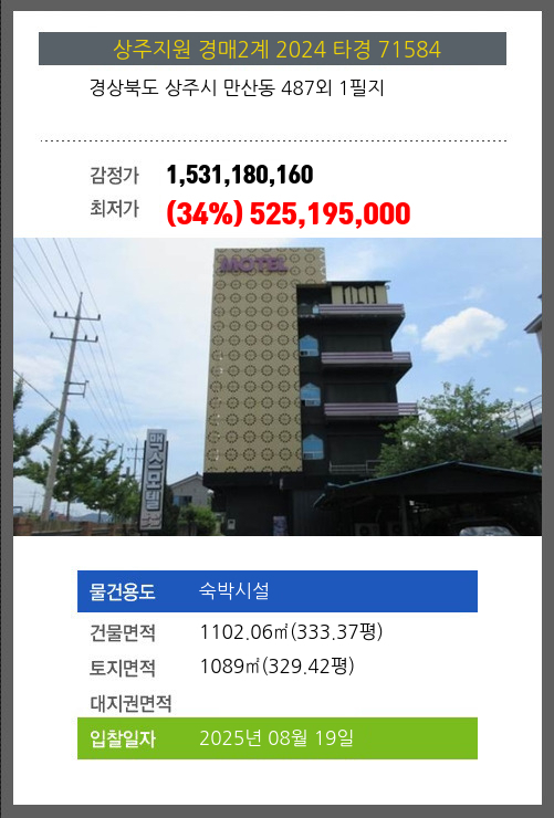 사건번호 2024 타경 71584 본건은 경상북도 상주시 만산동 487외 1필지소재하는 숙박시설경매 물건의 포스팅입니다. 건물면적 [ 1102.06㎡ (333.37평) ]토지면적 [ 1089㎡ (329.42평) ] 시세를 반영한 감정가