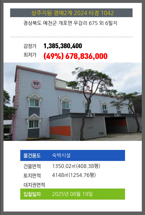 사건번호 2024 타경 1042 본건은 경상북도 예천군 개포면 우감리 675 외 6필지소재하는 숙박시설경매 물건의 포스팅입니다. 건물면적 [ 1350.02㎡ (408.38평) ]토지면적 [ 4148㎡ (1254.76평) ] 시세를