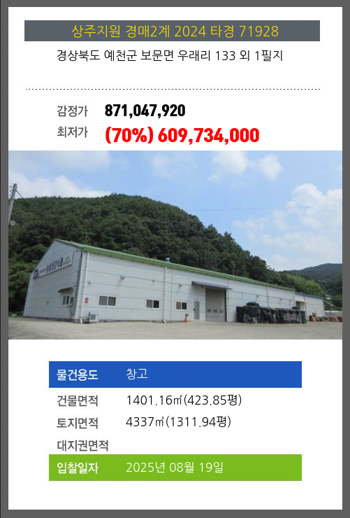 사건번호 2024 타경 71928 본건은 경상북도 예천군 보문면 우래리 133 외 1필지소재하는 창고경매 물건의 포스팅입니다. 건물면적 [ 1401.16㎡ (423.85평) ]토지면적 [ 4337㎡ (1311.94평) ] 시세를