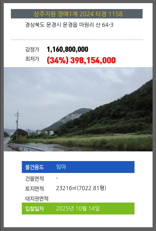 사건번호 2024 타경 1158 본건은 경상북도 문경시 문경읍 마원리 산 64-3소재하는 임야경매 물건의 포스팅입니다. 토지면적 [ 23216㎡ (7022.81평) ] 시세를 반영한 감정가 1,160,800,000에서3회 유찰되어 감정가