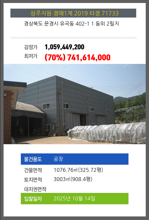 사건번호 2019 타경 71733 본건은 경상북도 문경시 유곡동 402-1 1 동외 2필지소재하는 공장경매 물건의 포스팅입니다. 건물면적 [ 1076.76㎡ (325.72평) ]토지면적 [ 3003㎡ (908.4평) ] 시세를