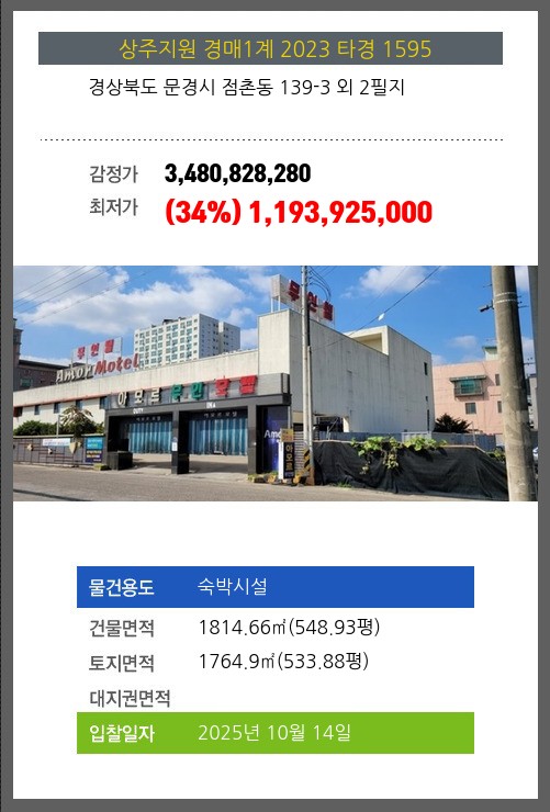 사건번호 2023 타경 1595 본건은 경상북도 문경시 점촌동 139-3 외 2필지소재하는 숙박시설경매 물건의 포스팅입니다. 건물면적 [ 1814.66㎡ (548.93평) ]토지면적 [ 1764.9㎡ (533.88평) ] 시세를 반영한