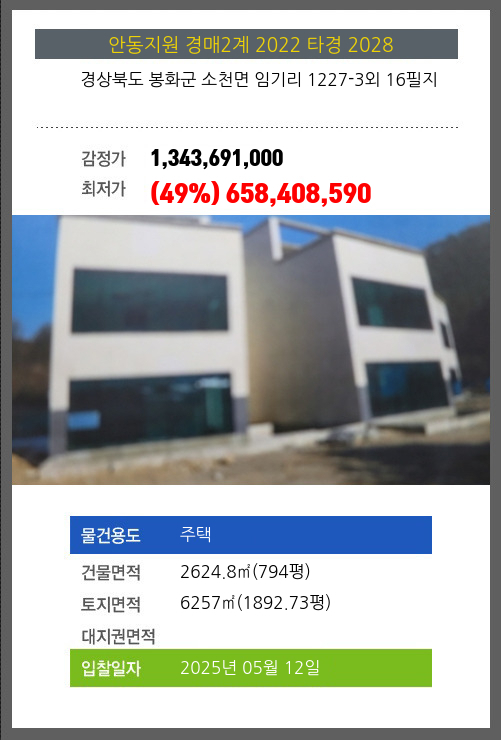 사건번호 2022 타경 2028 본건은 경상북도 봉화군 소천면 임기리 1227-3외 16필지소재하는 주택경매 물건의 포스팅입니다. 건물면적 [ 2624.8㎡ (794평) ]토지면적 [ 6257㎡ (1892.73평) ] 시세를 반영한