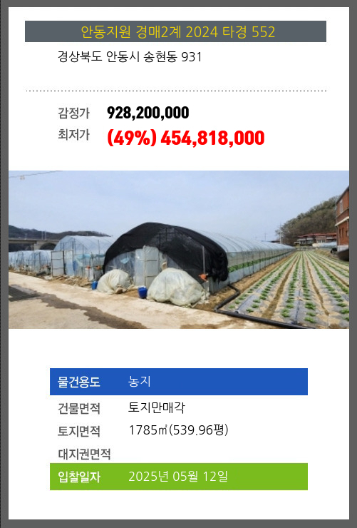 사건번호 2024 타경 552 본건은 경상북도 안동시 송현동 931소재하는 농지경매 물건의 포스팅입니다. 건물면적 [ 토지만매각 ]토지면적 [ 1785㎡ (539.96평) ] 시세를 반영한 감정가 928,200,000에서2회 유찰되어
