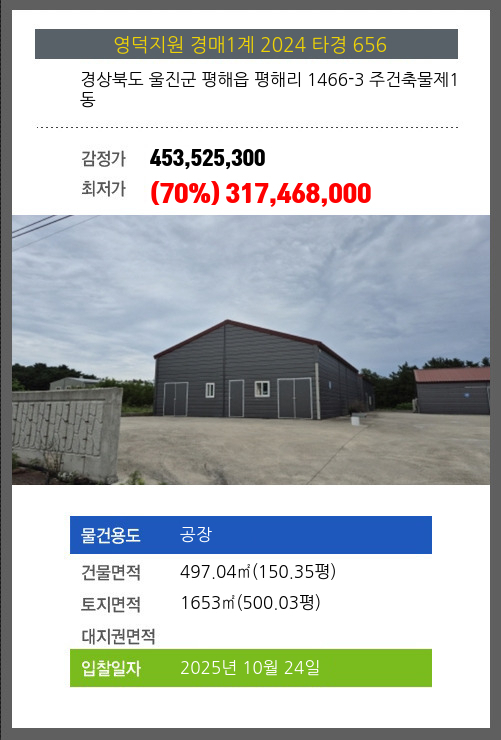 사건번호 2024 타경 656 본건은 경상북도 울진군 평해읍 평해리 1466-3 주건축물제1동소재하는 공장경매 물건의 포스팅입니다. 건물면적 [ 497.04㎡ (150.35평) ]토지면적 [ 1653㎡ (500.03평) ] 시세를 반영한
