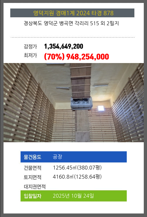 사건번호 2024 타경 878 본건은 경상북도 영덕군 병곡면 각리리 515 외 2필지소재하는 공장경매 물건의 포스팅입니다. 건물면적 [ 1256.45㎡ (380.07평) ]토지면적 [ 4160.8㎡ (1258.64평) ] 시세를