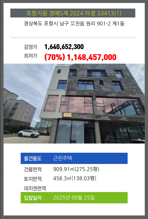 사건번호 2024 타경 33413(1) 본건은 경상북도 포항시 남구 오천읍 원리 901-2 제1동소재하는 근린주택경매 물건의 포스팅입니다. 건물면적 [ 909.91㎡ (275.25평) ]토지면적 [ 456.3㎡ (138.03평) ] 시세를