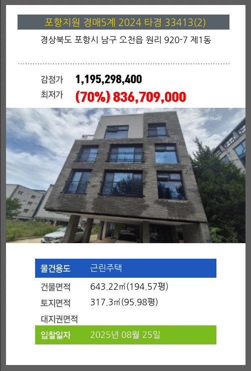 사건번호 2024 타경 33413(2) 본건은 경상북도 포항시 남구 오천읍 원리 920-7 제1동소재하는 근린주택경매 물건의 포스팅입니다. 건물면적 [ 643.22㎡ (194.57평) ]토지면적 [ 317.3㎡ (95.98평) ] 시세를