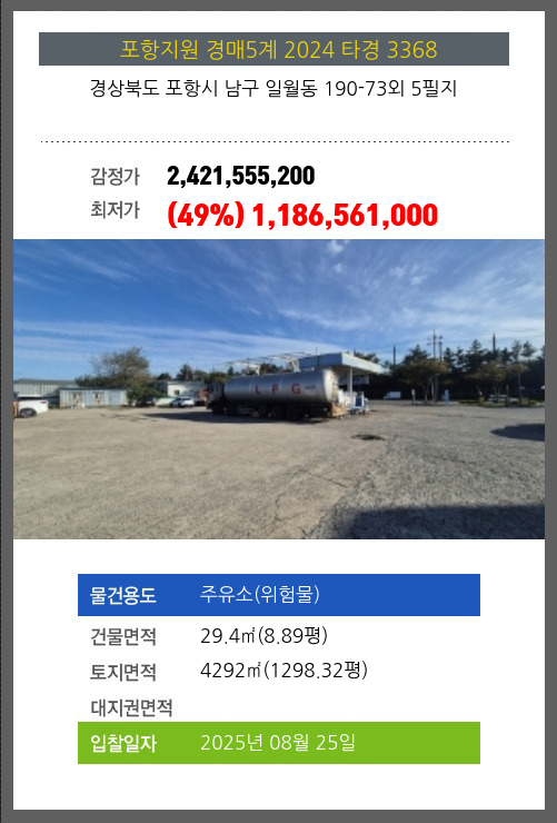 사건번호 2024 타경 3368 본건은 경상북도 포항시 남구 일월동 190-73외 5필지소재하는 주유소(위험물)경매 물건의 포스팅입니다. 건물면적 [ 29.4㎡ (8.89평) ]토지면적 [ 4292㎡ (1298.32평) ] 시세를 반영한