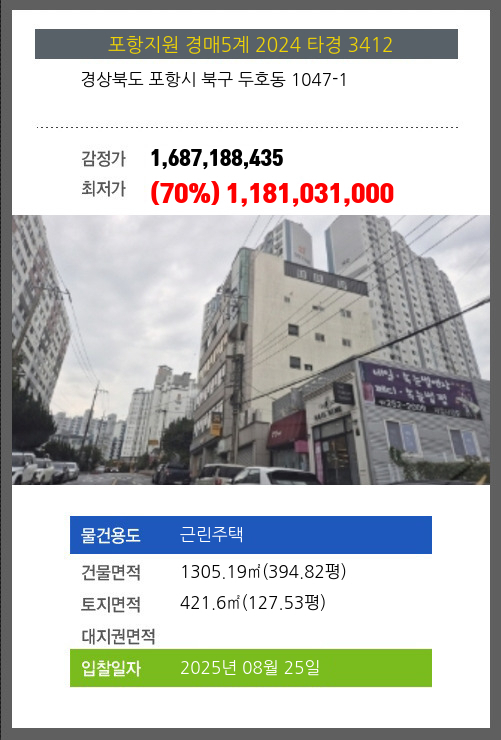 사건번호 2024 타경 3412 본건은 경상북도 포항시 북구 두호동 1047-1소재하는 근린주택경매 물건의 포스팅입니다. 건물면적 [ 1305.19㎡ (394.82평) ]토지면적 [ 421.6㎡ (127.53평) ] 시세를 반영한 감정가