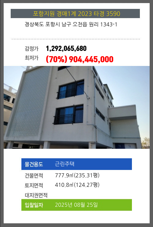 사건번호 2023 타경 3590 본건은 경상북도 포항시 남구 오천읍 원리 1343-1소재하는 근린주택경매 물건의 포스팅입니다. 건물면적 [ 777.9㎡ (235.31평) ]토지면적 [ 410.8㎡ (124.27평) ] 시세를 반영한