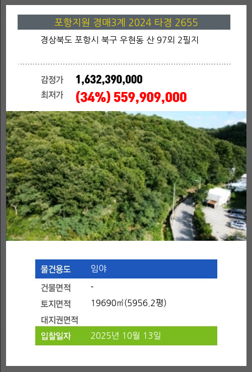 사건번호 2024 타경 2655 본건은 경상북도 포항시 북구 우현동 산 97외 2필지소재하는 임야경매 물건의 포스팅입니다. 토지면적 [ 19690㎡ (5956.2평) ] 시세를 반영한 감정가 1,632,390,000에서3회 유찰되어