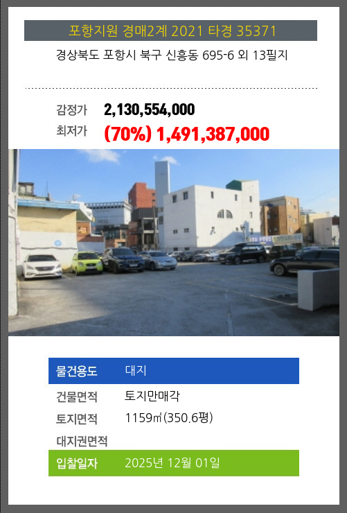 사건번호 2021 타경 35371 본건은 경상북도 포항시 북구 신흥동 695-6 외 13필지소재하는 대지경매 물건의 포스팅입니다. 건물면적 [ 토지만매각 ]토지면적 [ 1159㎡ (350.6평) ] 시세를 반영한