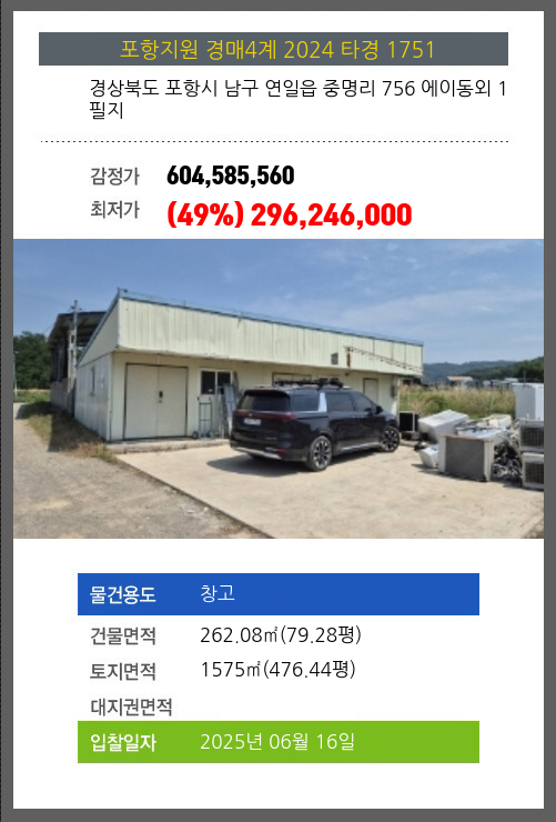 사건번호 2024 타경 1751 본건은 경상북도 포항시 남구 연일읍 중명리 756 에이동외 1필지소재하는 창고경매 물건의 포스팅입니다. 건물면적 [ 262.08㎡ (79.28평) ]토지면적 [ 1575㎡ (476.44평) ]