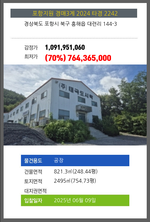사건번호 2024 타경 2242 본건은 경상북도 포항시 북구 흥해읍 대련리 144-3소재하는 공장경매 물건의 포스팅입니다. 건물면적 [ 821.3㎡ (248.44평) ]토지면적 [ 2495㎡ (754.73평) ] 시세를 반영한