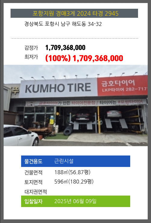 사건번호 2024 타경 2945 본건은 경상북도 포항시 남구 해도동 34-32소재하는 근린시설경매 물건의 포스팅입니다. 건물면적 [ 188㎡ (56.87평) ]토지면적 [ 596㎡ (180.29평) ] 시세를 반영한 감정가
