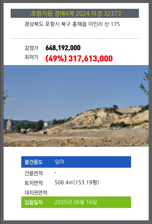 사건번호 2024 타경 32373 본건은 경상북도 포항시 북구 흥해읍 이인리 산 175소재하는 임야경매 물건의 포스팅입니다. 토지면적 [ 506.4㎡ (153.19평) ] 시세를 반영한 감정가 648,192,000에서2회 유찰되어