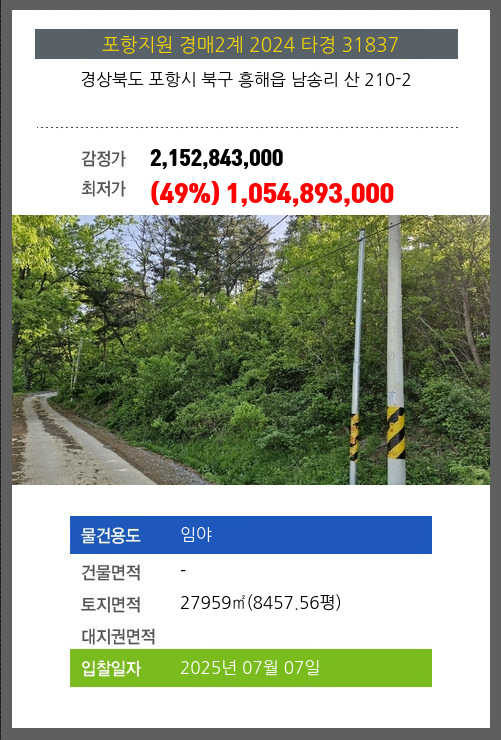 사건번호 2024 타경 31837 본건은 경상북도 포항시 북구 흥해읍 남송리 산 210-2소재하는 임야경매 물건의 포스팅입니다. 토지면적 [ 27959㎡ (8457.56평) ] 시세를 반영한 감정가 2,152,843,000에서2회 유찰되어