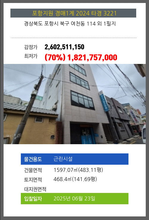 사건번호 2024 타경 3221 본건은 경상북도 포항시 북구 여천동 114 외 1필지소재하는 근린시설경매 물건의 포스팅입니다. 건물면적 [ 1597.07㎡ (483.11평) ]토지면적 [ 468.4㎡ (141.69평) ] 시세를