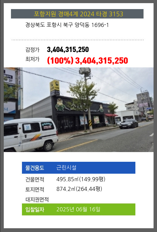 사건번호 2024 타경 3153 본건은 경상북도 포항시 북구 양덕동 1696-1소재하는 근린시설경매 물건의 포스팅입니다. 건물면적 [ 495.85㎡ (149.99평) ]토지면적 [ 874.2㎡ (264.44평) ] 시세를 반영한 감정가