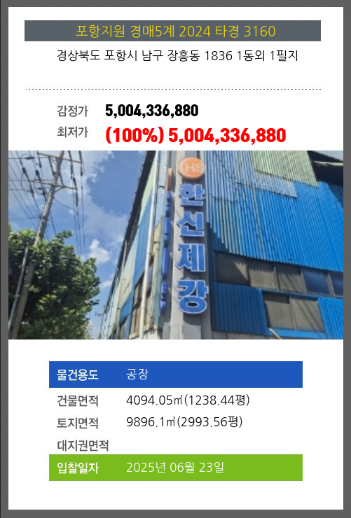 사건번호 2024 타경 3160 본건은 경상북도 포항시 남구 장흥동 1836 1동외 1필지소재하는 공장경매 물건의 포스팅입니다. 건물면적 [ 4094.05㎡ (1238.44평) ]토지면적 [ 9896.1㎡ (2993.56평) ] 시세를