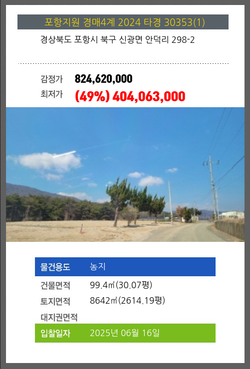 사건번호 2024 타경 30353(1) 본건은 경상북도 포항시 북구 신광면 안덕리 298-2소재하는 농지경매 물건의 포스팅입니다. 건물면적 [ 99.4㎡ (30.07평) ]토지면적 [ 8642㎡ (2614.19평) ] 시세를 반영한