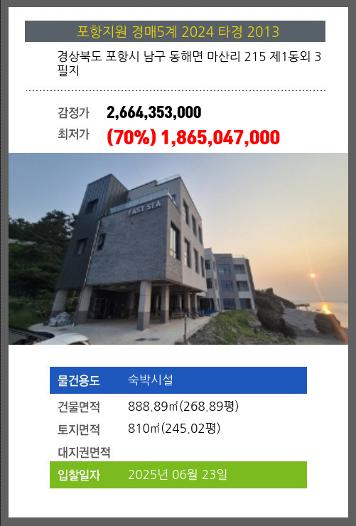 사건번호 2024 타경 2013 본건은 경상북도 포항시 남구 동해면 마산리 215 제1동외 3필지소재하는 숙박시설경매 물건의 포스팅입니다. 건물면적 [ 888.89㎡ (268.89평) ]토지면적 [ 810㎡ (245.02평) ]