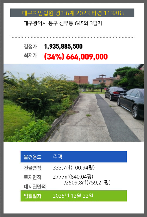 사건번호 2023 타경 113885 본건은 대구광역시 동구 신무동 645외 3필지소재하는 주택경매 물건의 포스팅입니다. 건물면적 [ 333.7㎡ (100.94평) ]토지면적 [ 전체:2777㎡ (840.04평) 매각지분:2509.8㎡ (759.21평) ] 시세를
