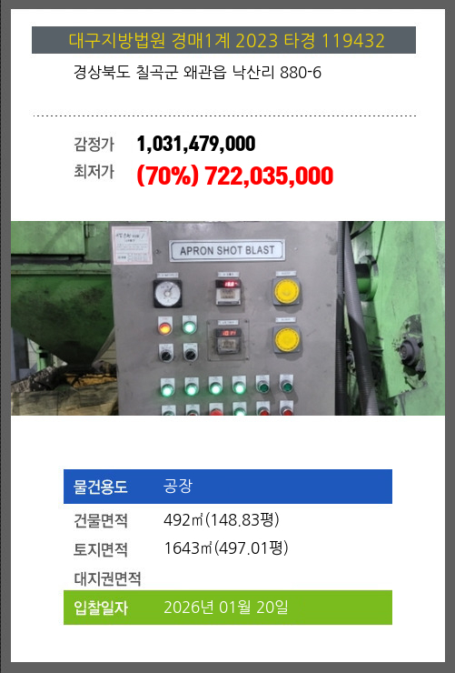 사건번호 2023 타경 119432 본건은 경상북도 칠곡군 왜관읍 낙산리 880-6소재하는 공장경매 물건의 포스팅입니다. 건물면적 [ 492㎡ (148.83평) ]토지면적 [ 1643㎡ (497.01평) ] 시세를 반영한 감정가
