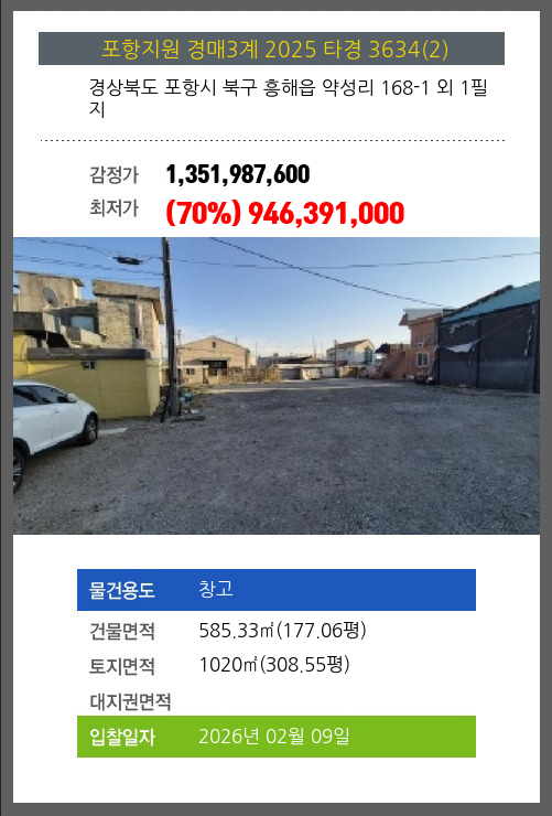 사건번호 2025 타경 3634(2) 본건은 경상북도 포항시 북구 흥해읍 약성리 168-1 외 1필지소재하는 창고경매 물건의 포스팅입니다. 건물면적 [ 585.33㎡ (177.06평) ]토지면적 [ 1020㎡ (308.55평) ]