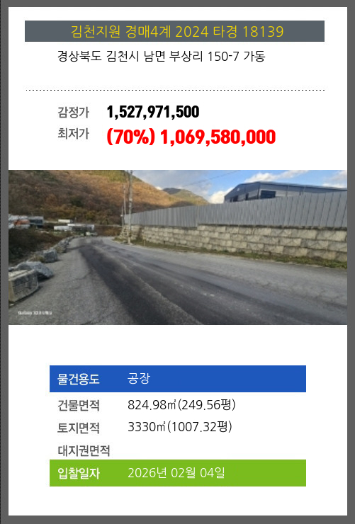 사건번호 2024 타경 18139 본건은 경상북도 김천시 남면 부상리 150-7 가동소재하는 공장경매 물건의 포스팅입니다. 건물면적 [ 824.98㎡ (249.56평) ]토지면적 [ 3330㎡ (1007.32평) ] 시세를 반영한