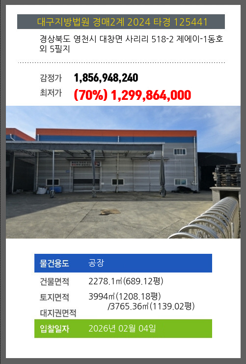 사건번호 2024 타경 125441 본건은 경상북도 영천시 대창면 사리리 518-2 제에이-1동호외 5필지소재하는 공장경매 물건의 포스팅입니다. 건물면적 [ 2278.1㎡ (689.12평) ]토지면적 [ 전체:3994㎡ (1208.18평) 매각지분:3765.36㎡ (1139.02평)