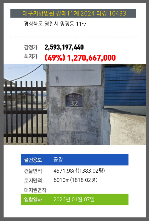 사건번호 2024 타경 10433 본건은 경상북도 영천시 망정동 11-7소재하는 공장경매 물건의 포스팅입니다. 건물면적 [ 4571.98㎡ (1383.02평) ]토지면적 [ 6010㎡ (1818.02평) ] 시세를 반영한 감정가 2,593,197,440에서2회